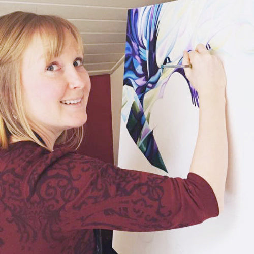 She studied art at Long Road College in Cambridge, UK, and discovered the magic of colour and shape in cubism and futurism, which have been a big influence on the development of her complex artistic style. Weaving in inspiration from geometric shapes, patterns, flow, energy and motion, her work moves you through the joys and beauty of nature. While her work can be quite abstract, she always maintains a familiar form for the viewer to connect with.Her creations have been described as representing the fractal nature of our existence.She works out of her home studio in Kimberley, British Columbia, and has proudly received awards for her works titled Kootenay Wildlife, Around the World, St. Mary’s Lake Serenity and Caged Bird. You can find her work in galleries and private collections across BC, Alberta and the UK.