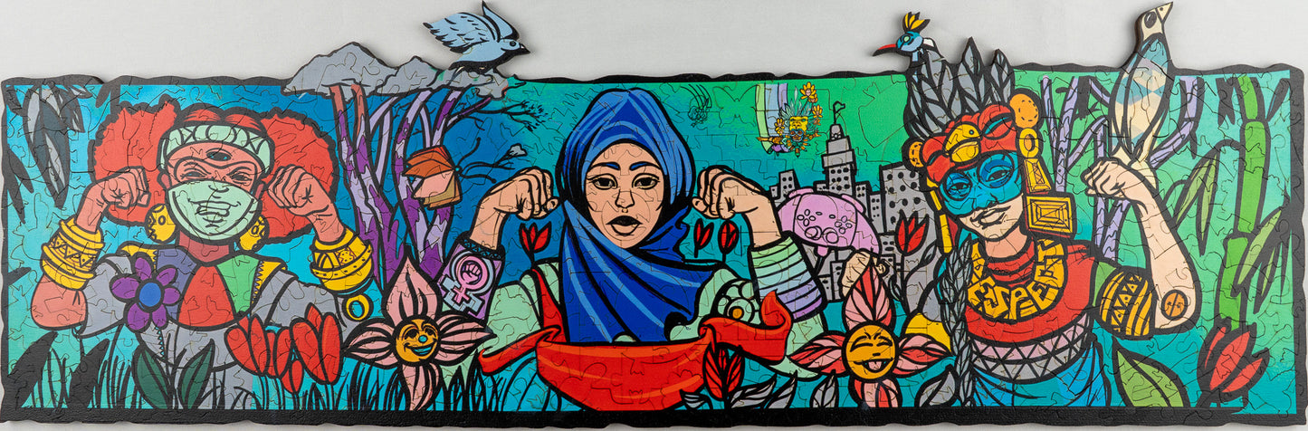Celebrate the next generation of changemakers with Future Kids, a vibrant and empowering wooden puzzle featuring original artwork by mural artist Timothy Bluitt. This panoramic design bursts with color and symbolism: from science and culture to justice and creativity. This mural artwork captures the strength, diversity, and dreams of today’s youth. Each character is a visual tribute to resilience, inclusion, and the bold spirit of the future.