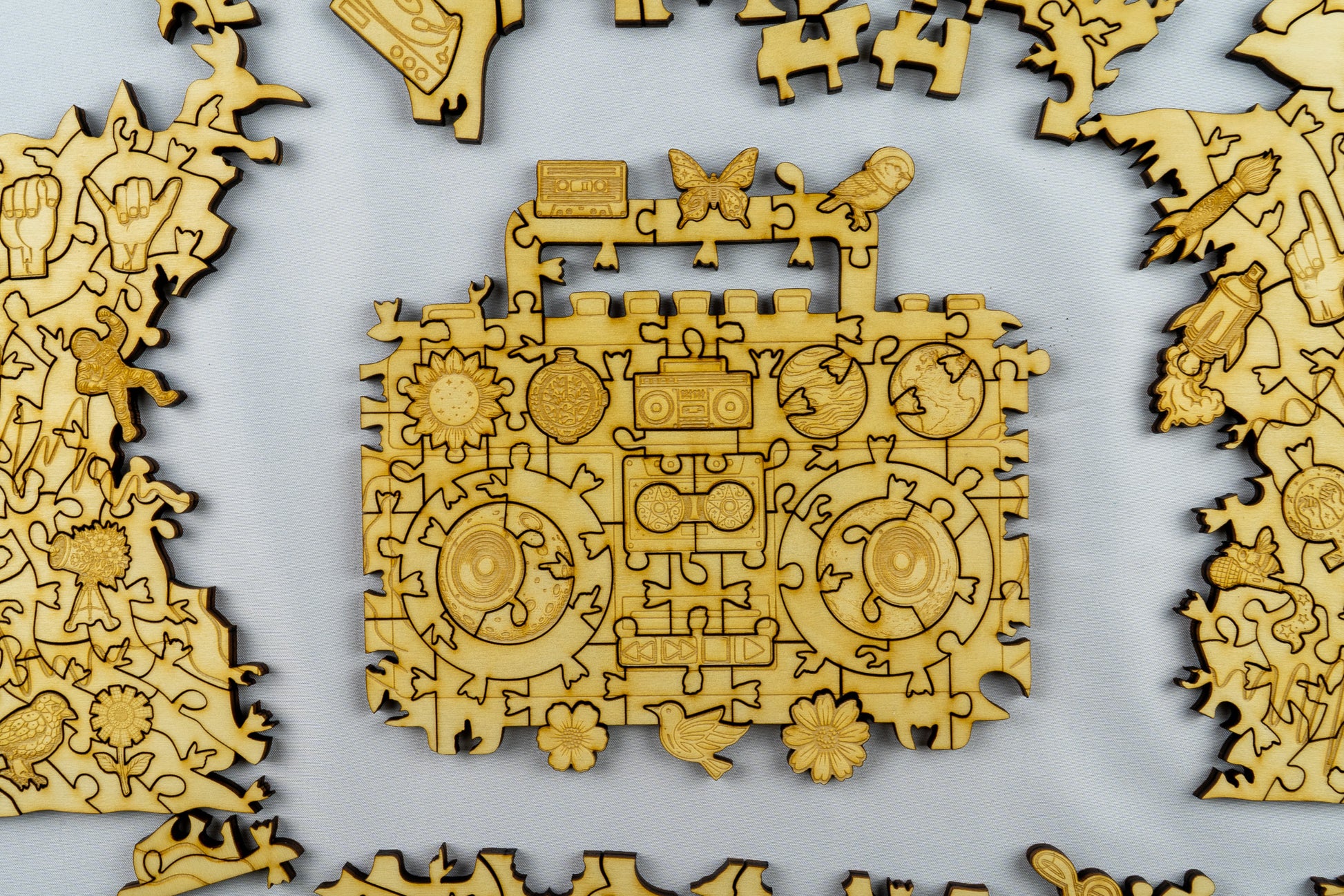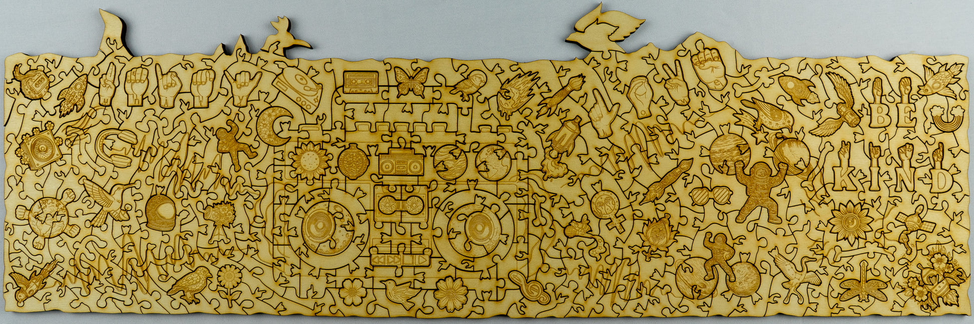Flip the puzzle over to reveal a deeply meaningful, fully engraved message board of whimsical pieces. From “Be Kind”, "Love" and "Unity" spelled in sign language to planets, rockets, cassette tapes, fists raised in unity, peace signs, birds in flight, blooming flowers and the boombox in the middle — the back side is a rich celebration of empathy, equality, science, and art. Every puzzle piece tells a story, sparking imagination and hope in equal measure.