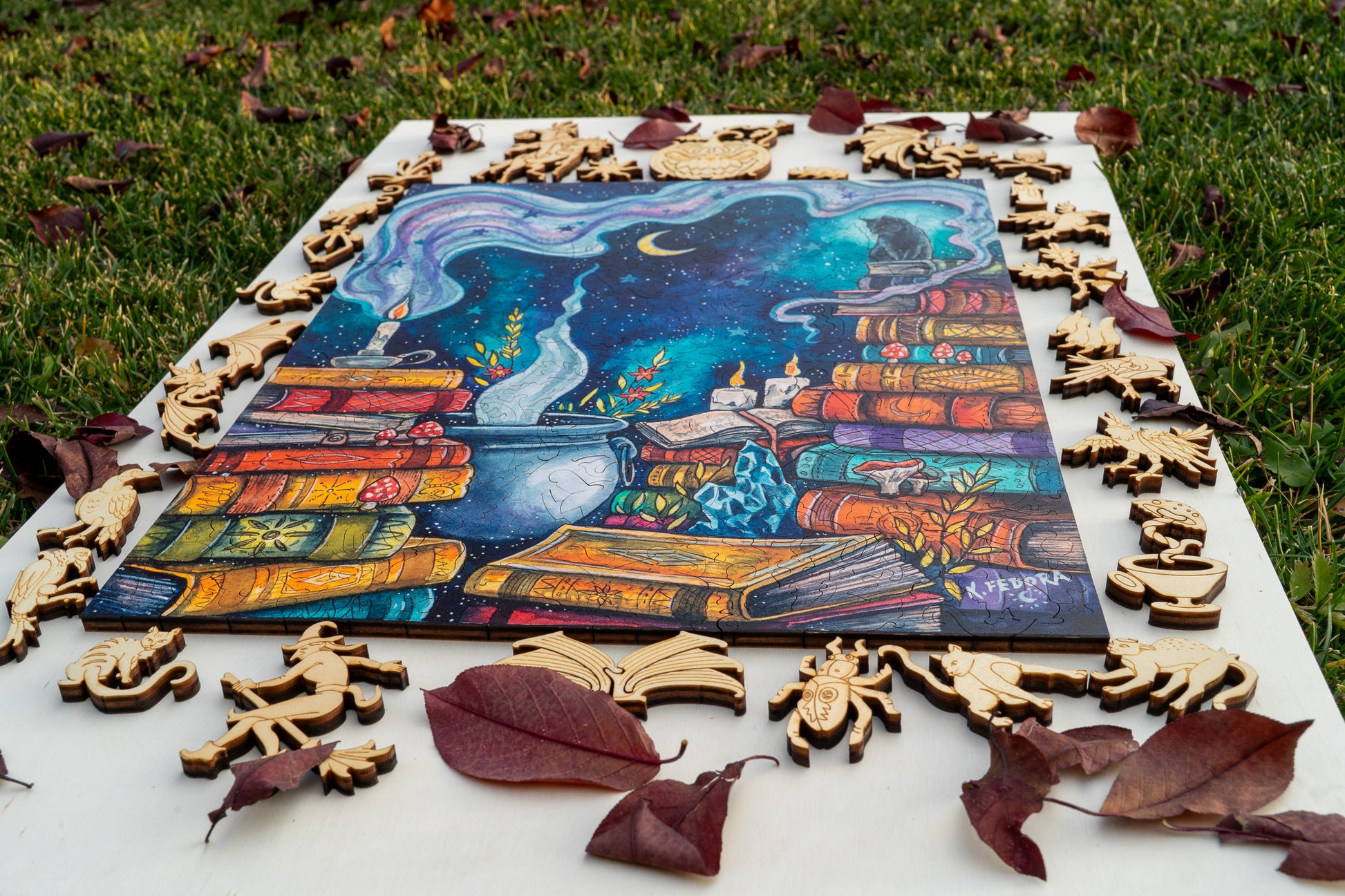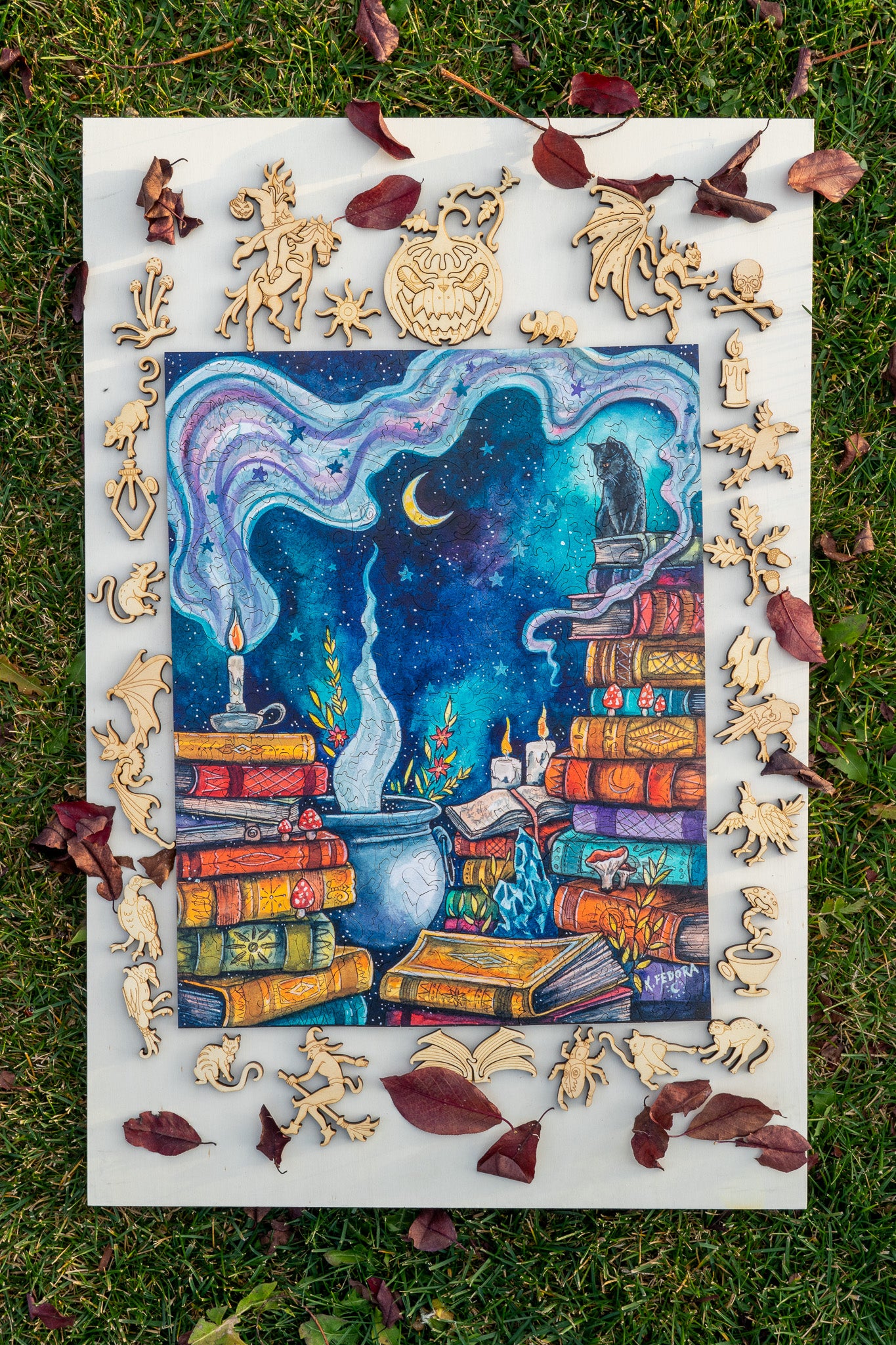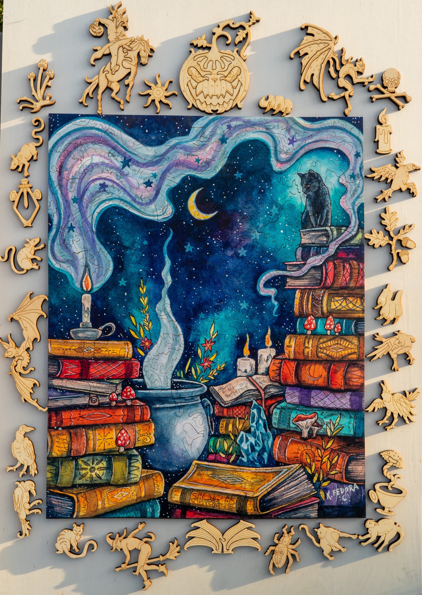 The world behind the puzzle reveals a hidden spellbook of symbols — a labyrinth of cats, ravens, skulls, witches, and potions, all etched into the wood like ancient runes. At the center glows the face of a mystical cat — the guardian of this arcane realm — surrounded by flying creatures, pumpkins, and enchanted talismans. Each engraving tells a story of curiosity, mischief, and wonder. It’s a place where spells come alive, and every piece connects the magic of night with the mystery of creation.