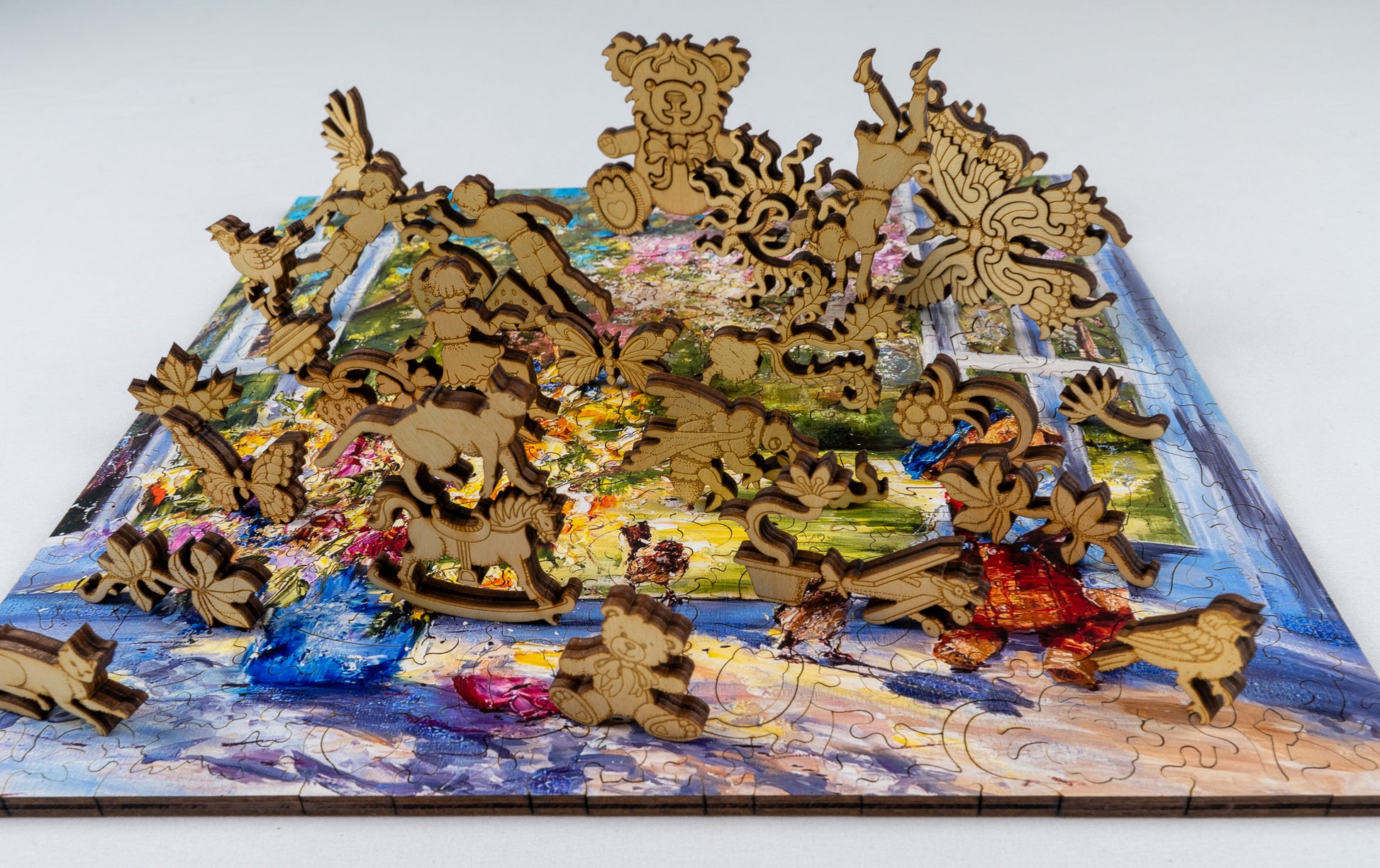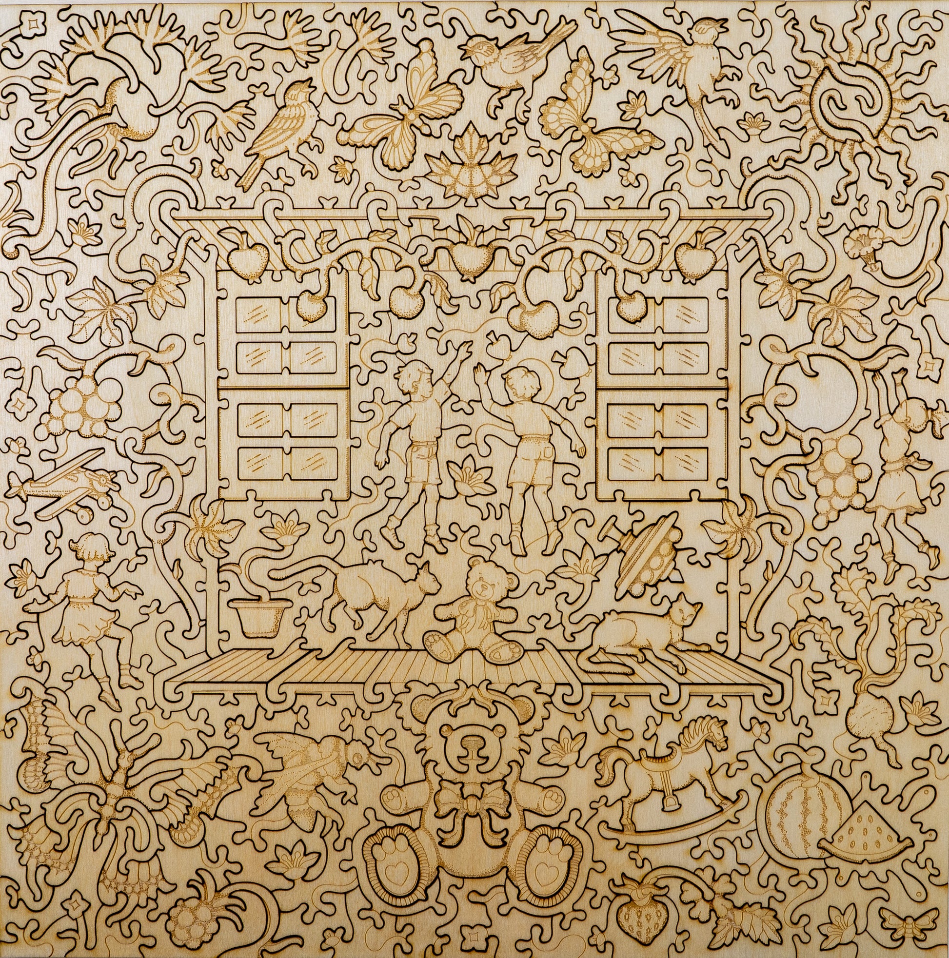 On the back side, the puzzle transforms into an intricate engraved story celebrating childhood, imagination, and the beauty of simple discoveries. A richly detailed composition unfolds around an open window at its center, where children reach outward as if drawn into a world of play and possibility. Surrounding them is a lively tapestry of whimsies: birds in flight, butterflies, blooming flowers, fruits, and flowing organic shapes weaving through the design. Playful element, such as a rocking horse, teddy bear, curious cats, and scattered natural motifs, invite exploration, while delicate vines and swirling patterns connect each piece into a harmonious whole. Every section reveals a small story, making the back side a captivating puzzle experience of its own.