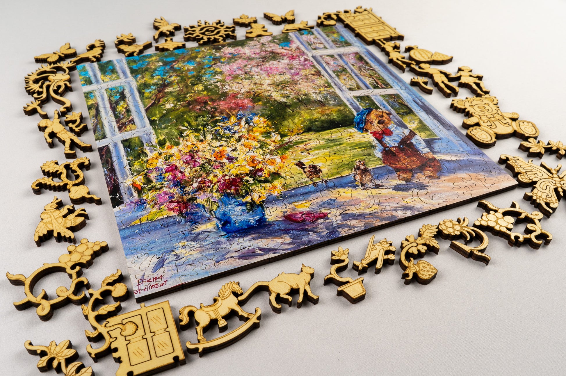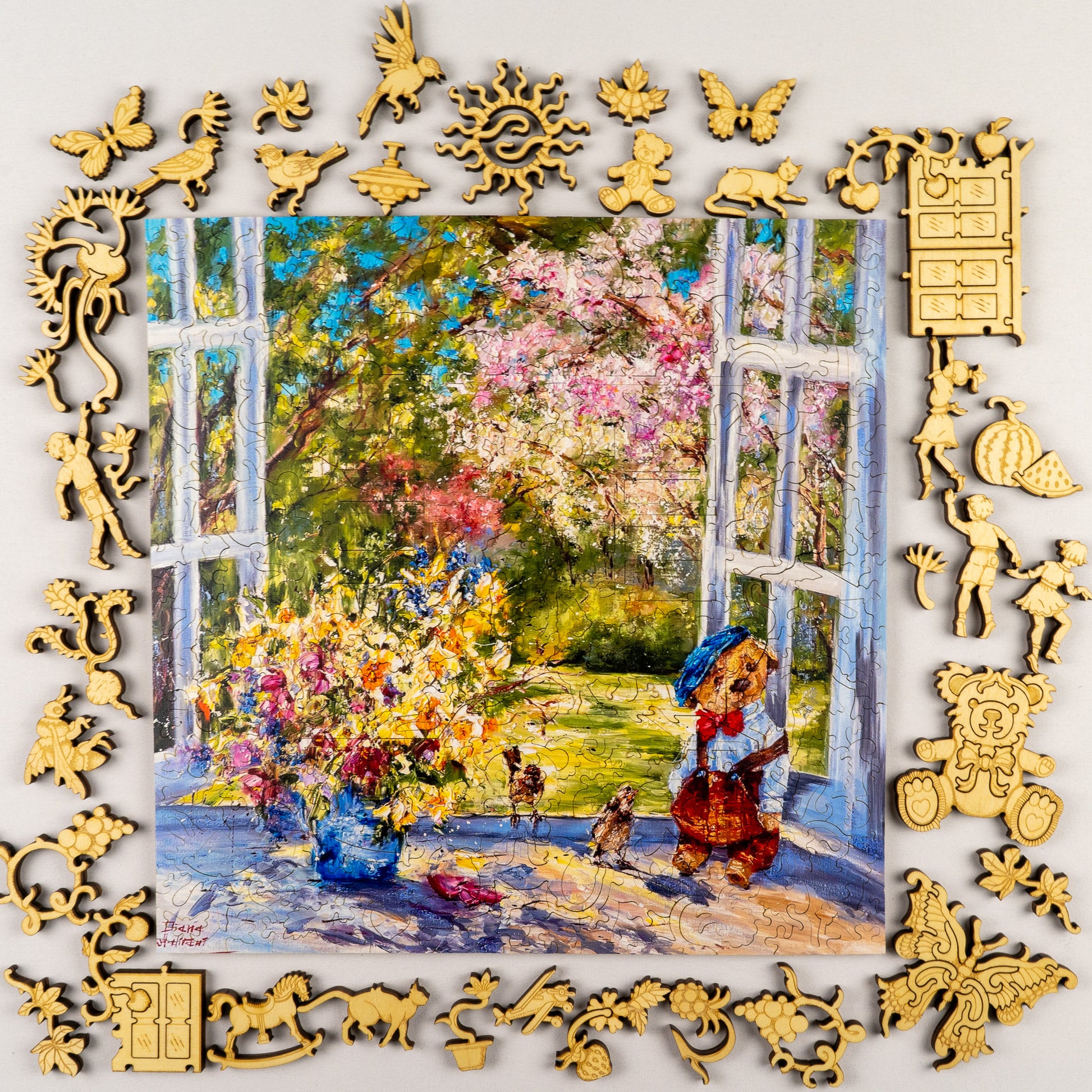 Spring Story – A gentle morning unfolds by an open window, where the freshness of spring breathes life into every detail. In this luminous wooden puzzle featuring the artwork of Diana Malivani, a vibrant bouquet spills across the windowsill, bursting with color and texture - yellows, pinks, and blues dancing in the soft sunlight. Beyond the window, a blossoming garden stretches into the distance, where trees awaken in delicate shades of spring. A small figure, dressed in warm tones with a blue beret, stands quietly nearby, accompanied by curious birds, as if sharing a peaceful moment of wonder.